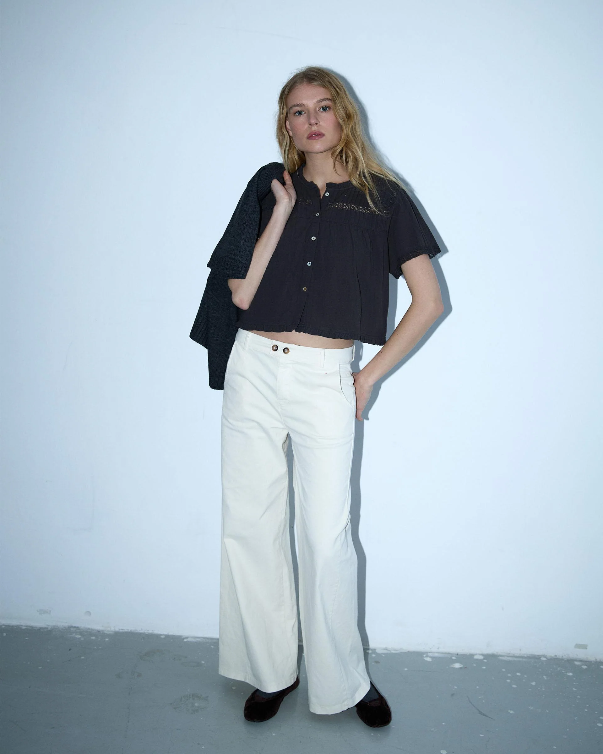 Blusa de manga corta con puntillas en delantero y botones a modo de cierre, de color gris oscuro.