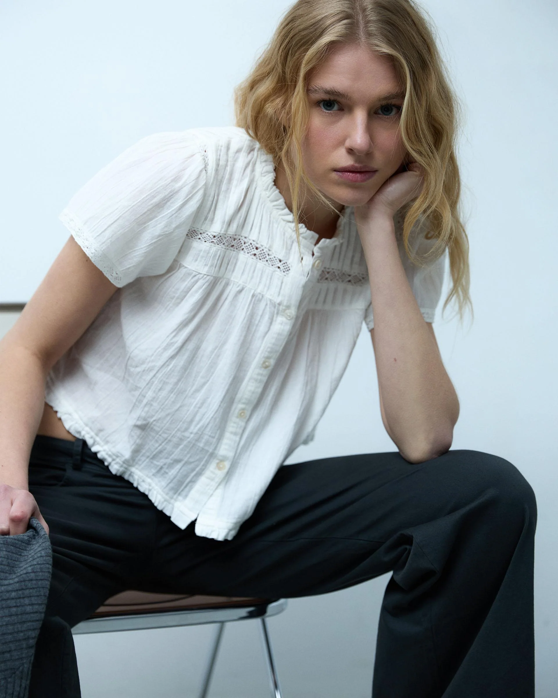 Blusa de manga corta con puntillas y botones en delantero a modo de cierre, de color blanco.