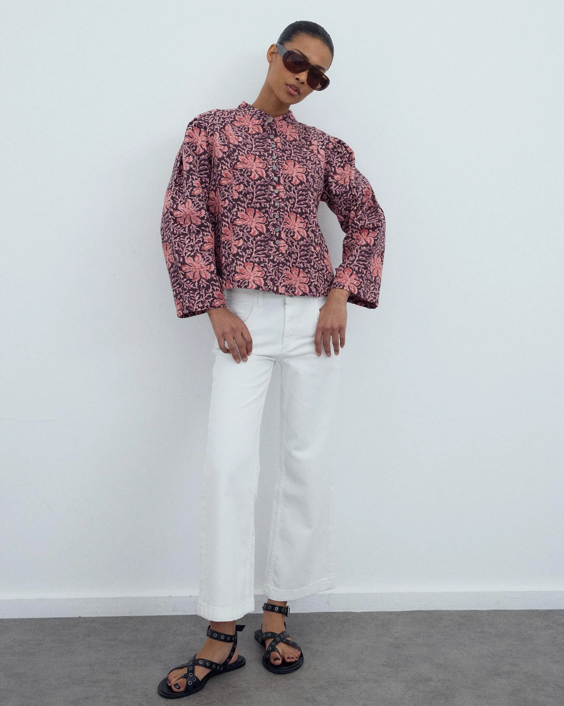 Chaqueta tipo cazadora, con botones en delantero a modo de cierre, cuello mao y detalle en espalda y puños con botón, con estampado de flores en tonos rosas.