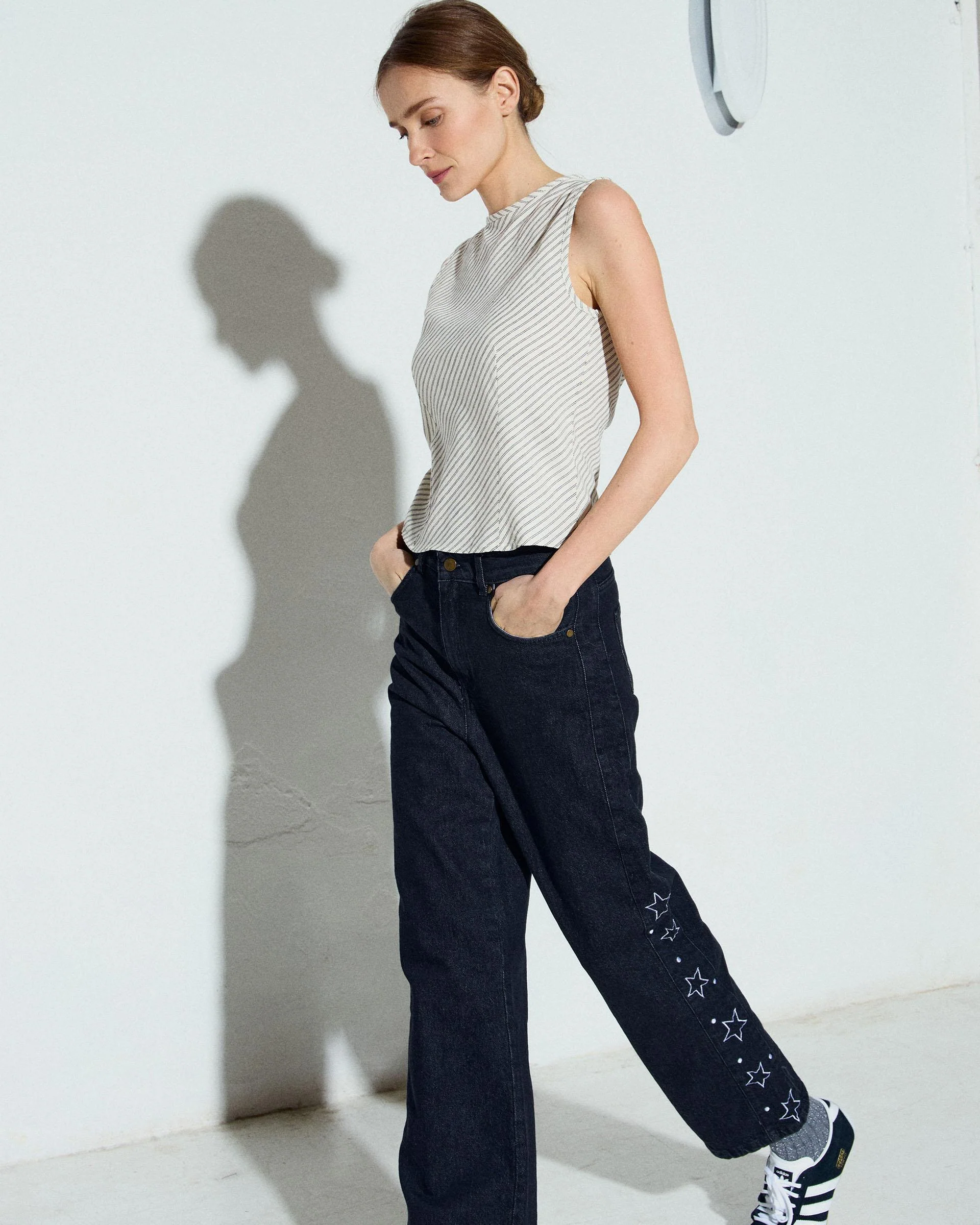 Top sin mangas de cuello redondo con estampado de rayas diagonales en blanco y negro.