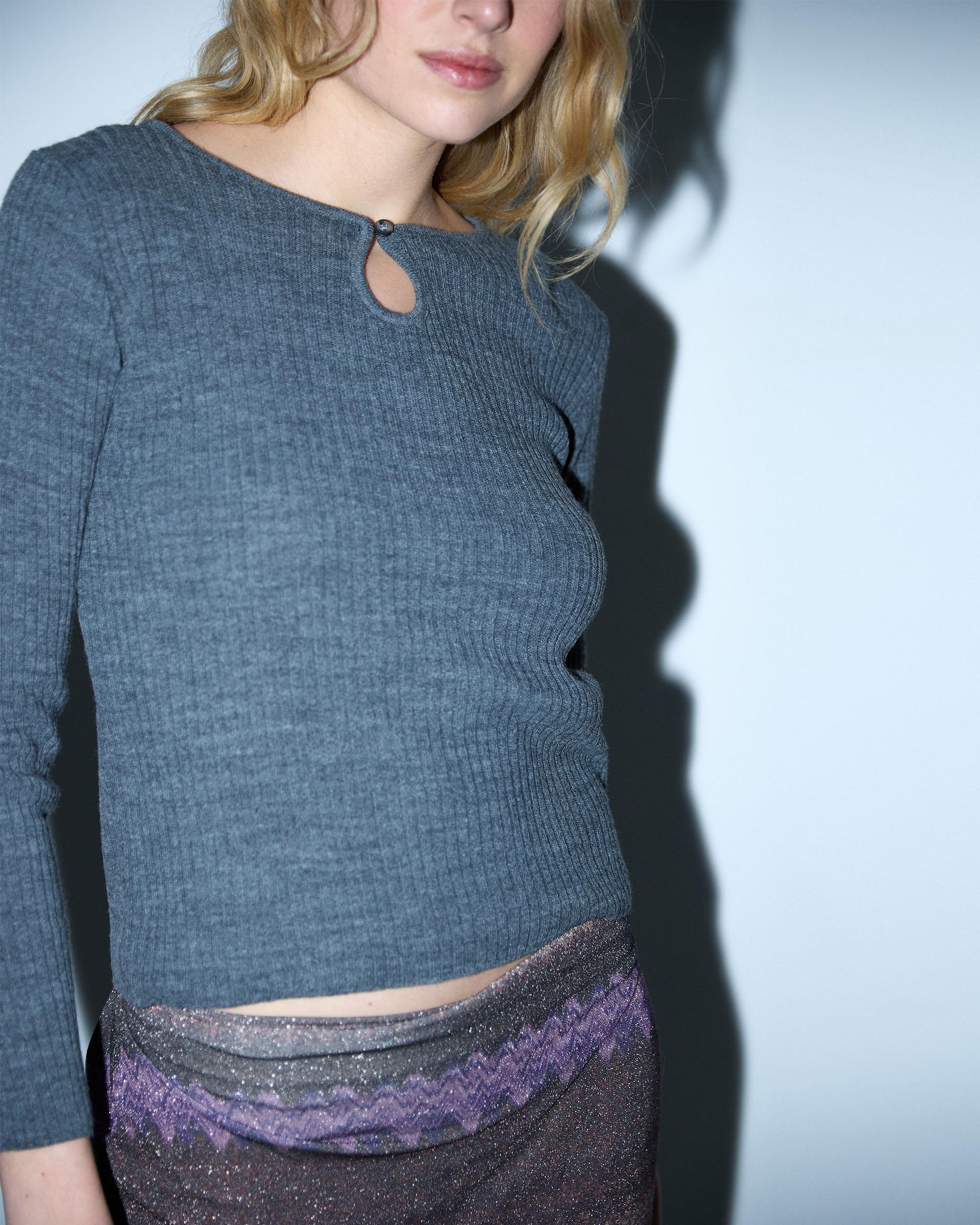 Top de manga larga con detalle de lágrima y botón en delantero, de color gris.