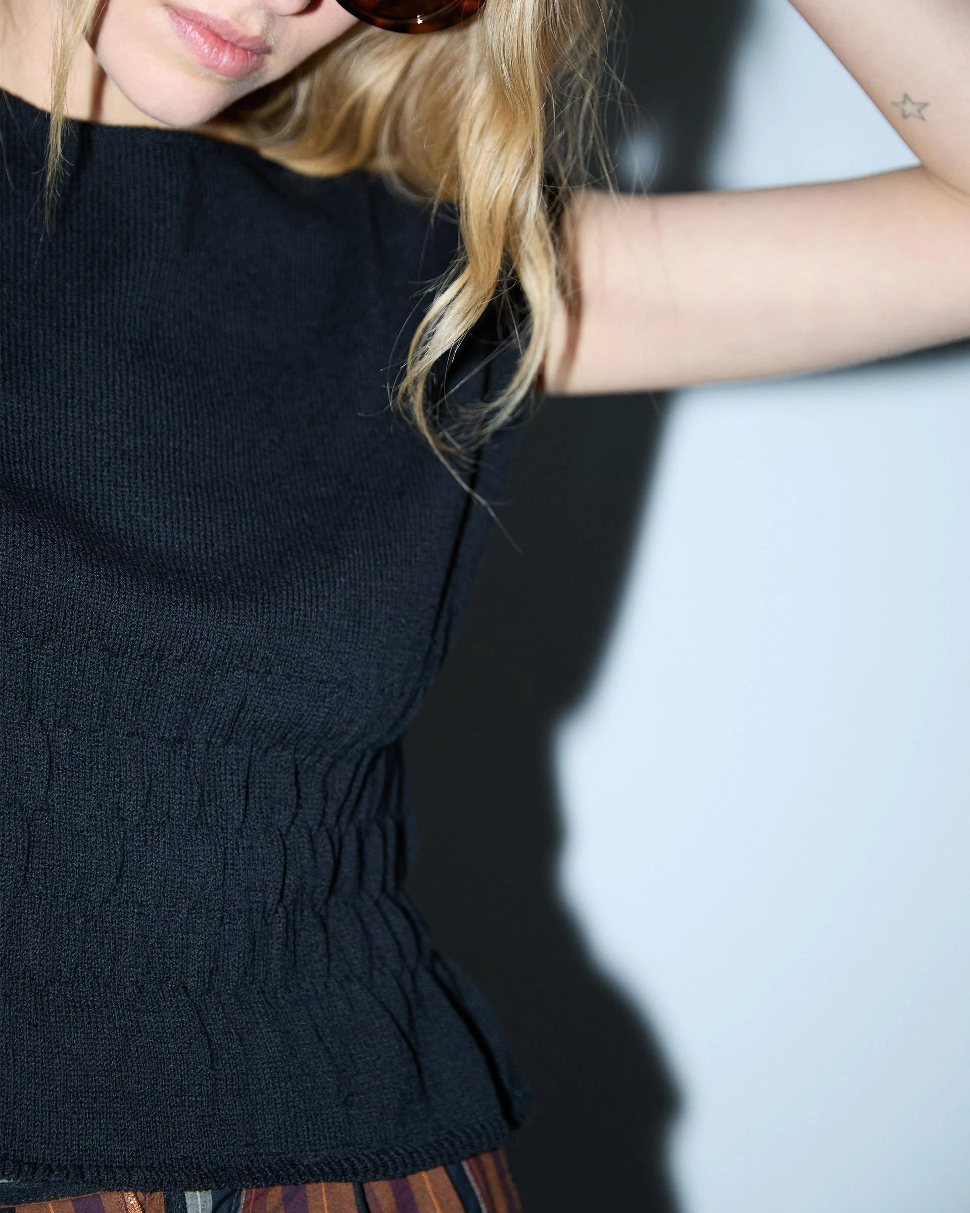 Top de punto con detalle de gomas en cintura, de color negro.